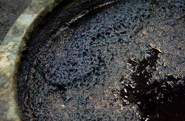 阿波藍は西暦900年頃中国から日本に伝わった栽培法を、蜂須賀公が吉野川流域の気候風土が藍の栽培に適していると認め、この地に伝えたといわれています。藍染は“すくも”(収穫・乾燥した葉藍を発酵させたもの)にアルカリやぶどう糖などの栄養源を入れ、約1週間じっとねかせて作った天然染液に幾度も浸すことにより、より深みのある鮮やかな濃い色に染め上がります。